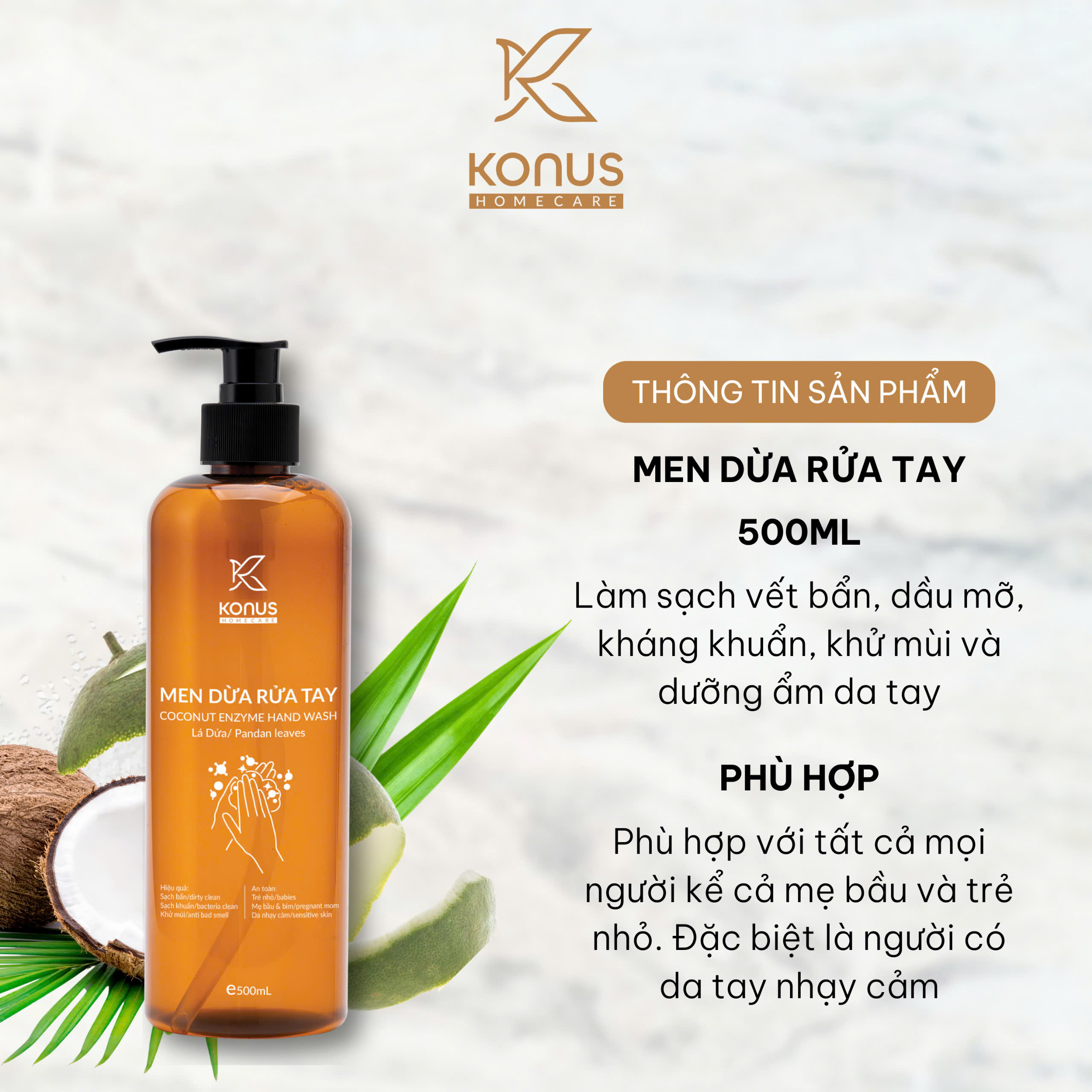 Enzyme Rửa Tay được sản xuất có chứa 85% nông sản Việt thành phần chính là Enzyme dừa. Enzyme dừa là nước dừa lên men bằng hệ vi sinh vật trong quá trình chế biến dừa tại Bến Tre. Với bản chất là axit hữu cơ kết hợp với các các liệu pháp dân gian sử dụng như nước tro dừa, nước chiết lá dứa, muối bùn… giúp làm sạch và giữ ẩm da tay. An toàn cho trẻ nhỏ và người có da tay nhạy cảm.